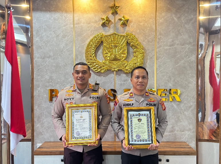 Kapolres Paser AKBP Novy Adi Wibowo bersama Kasat Polairud Iptu Andi Ferial meraih penghargaan Kapolda Kaltim. ( Doc. Humas Polres Paser).