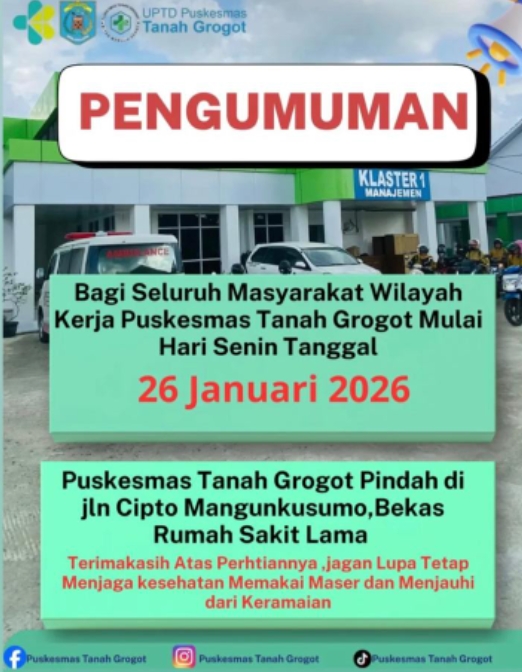 Kesadaran masyarakat untuk hidup sehat menjadi dasar penting dalam peningkatan layanan kesehatan. Menjawab kebutuhan tersebut, Puskesmas Tanah Grogot, Kabupaten Paser, Kalimantan Timur, resmi memulai pelayanan di lokasi baru, yakni gedung eks RS P. Sebaya di Jalan Dr. Cipto Mangunkusumo, terhitung mulai Senin (26/01).
